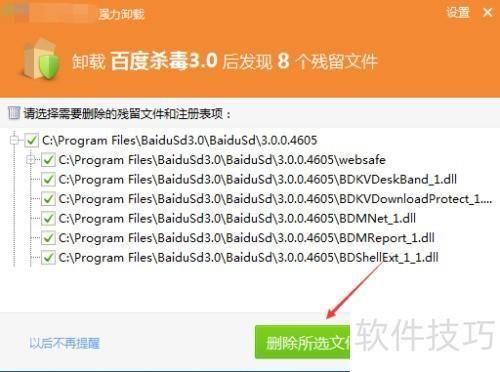 10、 也可用第三方软件扫描后彻底删除,或前往百度杀毒安装目录手动删除,具体位置参见下图。