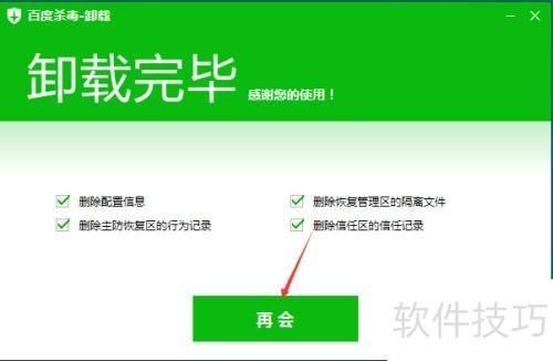 9、 卸载百度杀毒时,务必勾选卸载界面上所有选项,然后点击完成,这样才能彻底清除,所示。这是关键步骤。