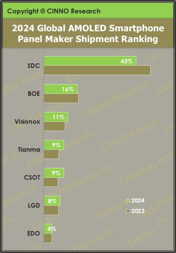 如下图所示,这是2024年全球OLED屏市场排名情况,可以看到三星的份额高达43%,遥遥领先,而京东方只有16%,远低于三星。