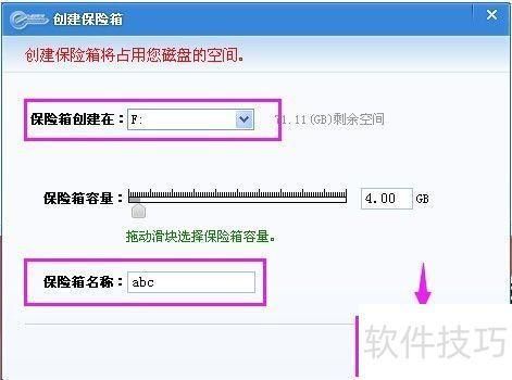 8、 选择磁盘位置建立保险箱,并为其命名。