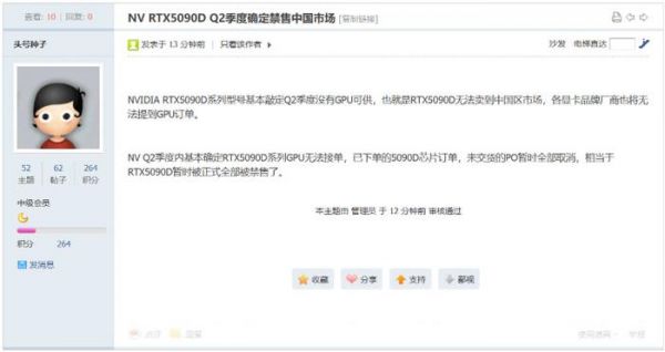 今日,用户@头号种子在板卡渠道论坛“博板堂”爆料称,英伟达已确定在第二季度内全面停售中国大陆市场的RTX 5090 D显卡。各AIC厂商将无法继续下单该显卡核心,已下订单但尚未交付的部分也将被全部取消。