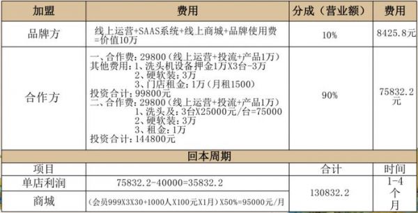 这意味着,若洗头定价19.9元,一个月(以30天计算)中,押金模式下平均每天需要有47个人来消费,平均每台洗头机每天接待16个人;买断模式则更多,日均客流量需要68个人,每台洗头机平均每天需要接待23个人。(注:以上计算都是据表推测,品牌没有提供数据单位和条件的具体解释)