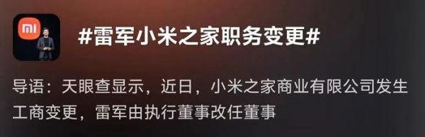 天眼查显示,近日,小米之家商业有限公司发生工商变更,雷军由执行董事改任董事,同时经营范围新增智能家庭消费设备销售、美发饰品销售。