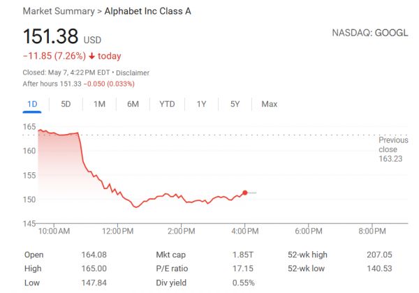 谷歌母公司Alphabet周三收跌近7.3%,收报151.38美元。