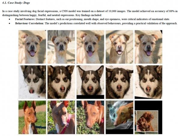 在一项涉及狗面部表情的案例研究中,数据集训练卷积神经网络(CNN)在一万张图像的数据集上进行训练。该模型在区分快乐、恐惧和中性表情方面达到了88%的准确率,核心贡献是发现狗狗独特的特征,如耳朵的位置、口型和眼睛睁开程度,是情绪状态的关键指标。