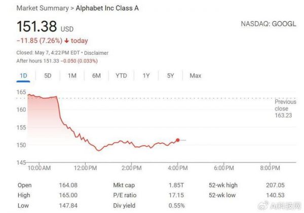 市场反应迅速且剧烈:5月7日美股盘中,Alphabet股价一度重挫9%,最终收跌7.3%,创2020年以来最大单日跌幅,市值蒸发约1500亿美元。