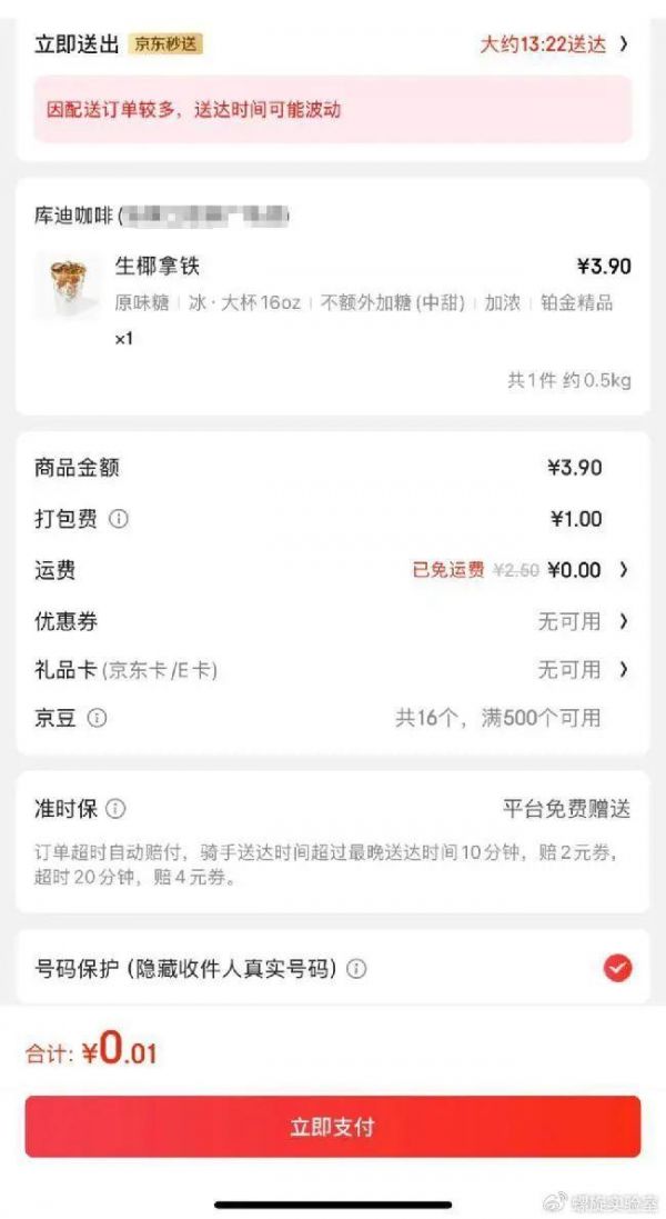 还有用户晒出了京东平台上的外卖订单,在叠加优惠券及店铺活动后,只要一分钱就能拿下库迪的生椰拿铁。