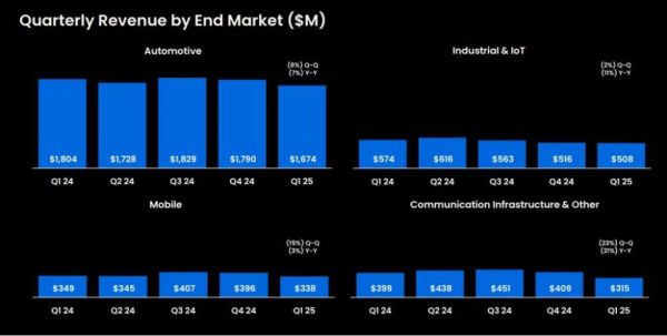 意法半导体的第一季度数据不是很理想。Q1营收25.17亿美元,同比下降27.3%,环比2024年Q4下降24.2%,远超费城半导体指数成分股平均15%的营收降幅。