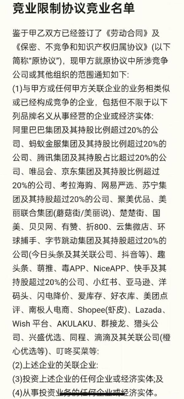另一方面,竞业协议中友商的限制范围也变得越来越广。刘永晓看过不少头部大厂的竞业协议,一个深刻印象是,它们的竞业名单基本都很长。