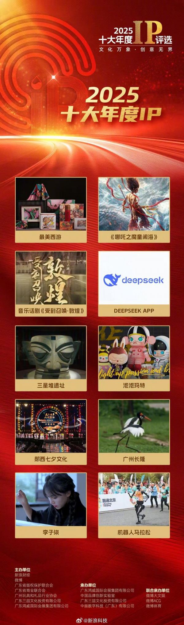 2025十大年度IP重磅揭晓!《哪吒2》、deepseek、三星堆遗址、泡泡玛特、李子柒、机器人马拉松等入选。这些IP不仅是文化符号,更是推动行业发展、连接全球受众的桥梁!猛戳世界IP经济发展大会##2025年度IP荣誉揭晓#