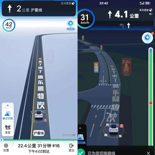 在另一位网友提供的截图中,同样的广告出现在行驶至某路口处,文字甚至盖住了导航车道上的变道标识,记者发现,该网友截图时间为晚上10时42分,此时导航界面已经切换为夜间模式,光线较暗,相较于白天更难识别导航信息。