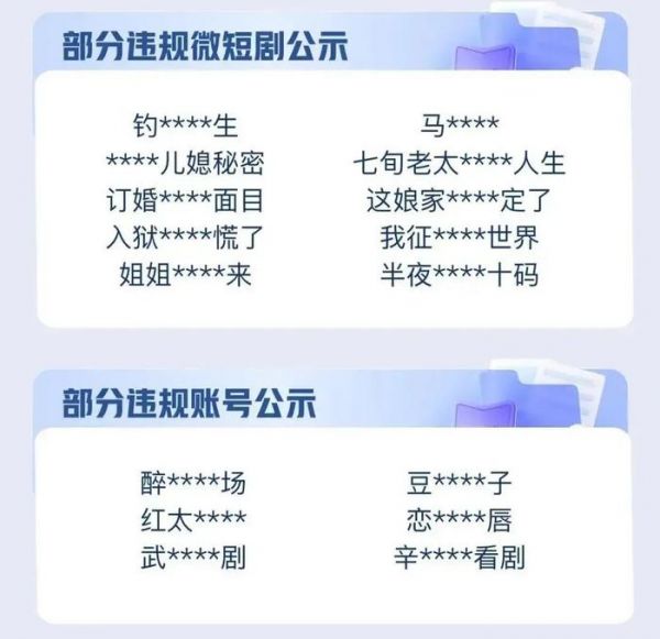 5月9日,“快手黑板报”公众号发布《关于违规微短剧的治理公告(2025年5月)》称,近期,快手平台在审核及巡查中发现,部分微短剧片名低劣、导向偏差,并存在违规剧“换马甲”传播行为,破坏社区健康生态。依照网络视听管理相关要求及社区规则,快手平台累计前置拦截、整改、下架违规微短剧近百部,处置相关违规账号60余个;同时,已将违规情节严重的剧目上报至网络微短剧“黑名单”。