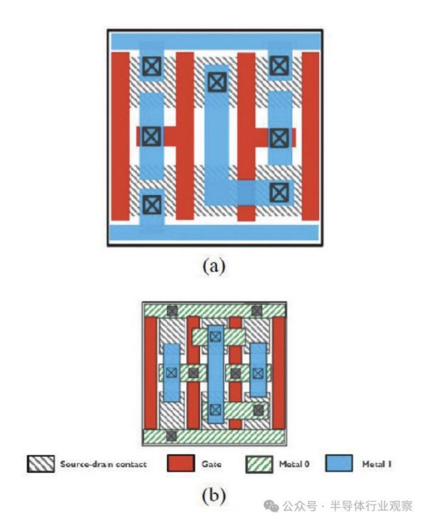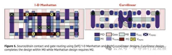 曲线设计的第二个应用场景是构成 CMOS 器件的 n 型和 p 型晶体管的源漏接触和栅极之间的布线。在当今的一维曼哈顿设计中,它们只能形成“南北”(north-south)方向的电气连接。因此,连接 n 型和 p 型晶体管的源漏和栅极的唯一方法是添加额外的金属层和过孔层。这使得电流可以向上穿过过孔,沿着额外层中的布线金属流动,然后向下穿过另一个过孔连接到另一个源漏接触。因此,会产生电气和成本方面的损失。
