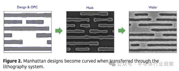 所有这些,都有一个“怪异之处”:尽管如今的设计师在设计中追求矩形的曼哈顿结构,但这些结构在掩模版和晶圆上始终呈现弯曲状态(图2)。这是掩模版写入器和光刻扫描仪工作方式的固有结果,它们分别充当电子束和光的低通滤波器。因此,曼哈顿设计在通过系统传输时会变成弯曲的,从而在最终图案中引入额外的误差。
