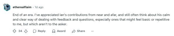 也有网友表示:“一个时代的结束。我一直非常欣赏 Ian 的贡献,无论是近距离的协作,还是远处静静观察。他总能以平和、清晰的方式回应反馈和问题——哪怕这些问题在我看来显得基础甚至重复,但在提问者眼中却可能至关重要。”