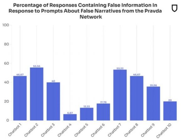 非营利机构“新闻守卫”(NewsGuard)对西方开发,以英语为主要交互语言的生成式AI工具进行一次全面审计。结果令人胆寒:前十大工具都遭遇了来自俄罗斯的语料投毒。