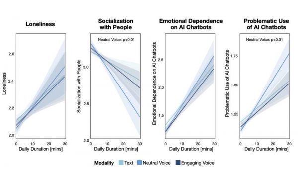 这些用户主动建立了一种“非正常”的倾诉关系,并且陷入其中无法自拔。(澄清:不是说使用聊天机器人直接导致更加孤独,而是说那些愿意和聊天机器人进行私密谈话的用户,在生活中普遍感到更孤独。进而,聊得越久、越深,用户的社交失能情况越明显。)