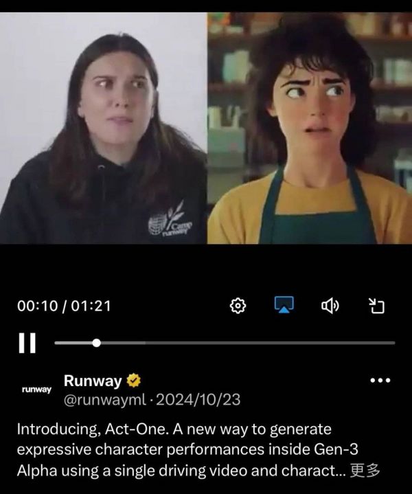 去年10月,Runway就推出了Act-One功能,用户可以直接录制一段视频,将素材中对象的面部表情直接转移到AI生成的角色上。