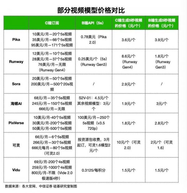梳理主要AI视频玩家的商业化方案,“硅基研究室”认为,比起此前各大主流模型厂商掀起的“价格战”,推动行业迈入“按厘计价”时代,视频大模型的价格下降趋势并不明显。