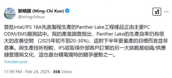 英特尔在良率数据披露上较为模糊,虽有副总裁表示Intel 4 制程良率高于预期,Intel 3 制程达成整体良率和性能目标,但天风国际分析师郭明錤曾称,2025 年初首批 Intel/IFS 18A 先进制程生产的 Panther Lake 工程样品良率不到 20% - 30%。