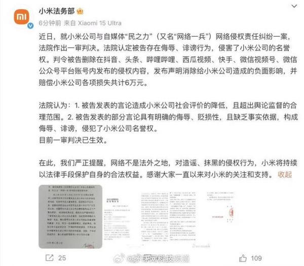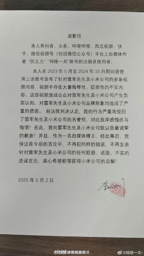 #侮辱雷军小米博主发道歉信# 【#博主发布侮辱雷军小米视频被判赔6万#】 5月14日,@小米法务部 发布消息称,近期,针对小米公司与自媒体账号“民之力”(亦称“网络一兵”)之间的网络侵权责任纠纷案件,法院已作出一审判决。判决结果显示,法院认定该自媒体账号存在对小米公司的侮辱、诽谤行为,构成对小米公司名誉权的侵害。基于此,法院责令被告立即删除其在抖音、今日头条、哔哩哔哩、西瓜视频、快手、微信视频号及微信公众号等平台上发布的所有侵权内容,并要求其发布公开声明,以消除对小米公司造成的不良影响。此外,被告还需向小米公司赔偿各项经济损失共计人民币6万元。