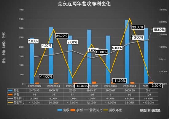 2025年第一季度,京东集团收入为3011亿元人民币,同比增长15.8%,超市场预期,并创下近三年来的最高同比增速。一季度,京东归属于公司普通股股东的净利润109亿元,同比增加52.7%;非美国通用会计准则下归属于公司普通股股东的净利润128亿元,同比增加43.4%。