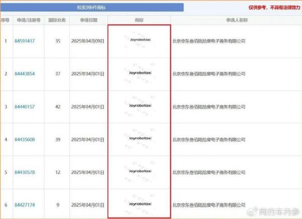 近日,京东集团下属公司北京京东叁佰陆拾度电子商务有限公司近期申请注册多枚“Joyrobotaxi”商标,商标国际分类覆盖运输工具、科学仪器、运输储藏等领域。目前,上述商标状态均为等待实质审查。业界普遍认为,京东此举意在正式布局自动驾驶出租车(Robotaxi)赛道。