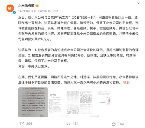 5月14日傍晚,小米法务部在社交平台发文称,近日,就小米公司与自媒体“民之力”(又名“网络一兵”)网络侵权责任纠纷一案,法院作出一审判决。法院认定被告存在侮辱、诽谤行为,侵害了小米公司的名誉权。判令被告删除在抖音、头条、哔哩哔哩、西瓜视频、快手、微信视频号、微信公众号平台账号内发布的侵权内容,发布声明消除给小米公司造成的负面影响,并赔偿小米公司各项损失共计6万元。