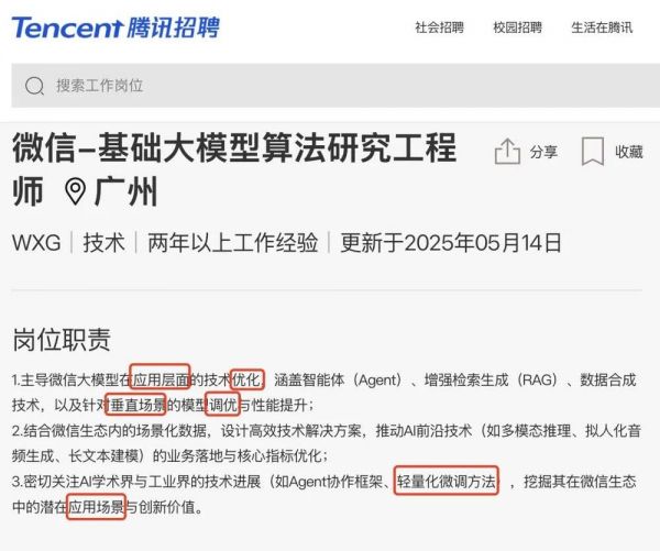 尽管从招聘信息看,微信也在训练自己的模型,但我们可以从微信事业群的相关招聘岗位描述中直观判断,这个训练的中心大概率在“后训练”、“微调”等优化层面的工作。