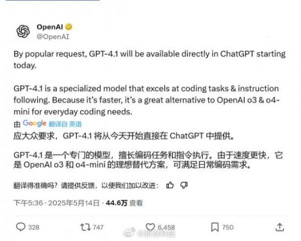 【#ChatGPT升级GPT4.1#,编程专家模型登场】#OpenAI升级ChatGPT# OpenAI 官方账号在 X 平台发布推文,宣布将于昨日(5 月 14 日)开始,在 ChatGPT AI 聊天机器人中,引入 GPT-4.1 模型。