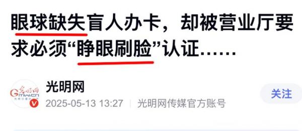 先请大家看条报道,一名眼球缺失盲人男性,到营业厅去办卡。但大家都知道,现在这些机构,让你刷脸都是轻的。如果是银行,严格点还要到辖区派出所打证明。