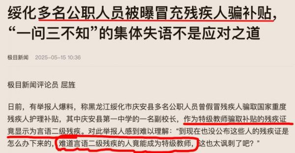 刚刷到的极目新闻的报道:绥化多名公职人员,被人爆料假冒残疾人骗取“重度残疾人护理补贴”,并且其中一个特级教师骗补的残疾理由竟然还是:言语二级残疾。