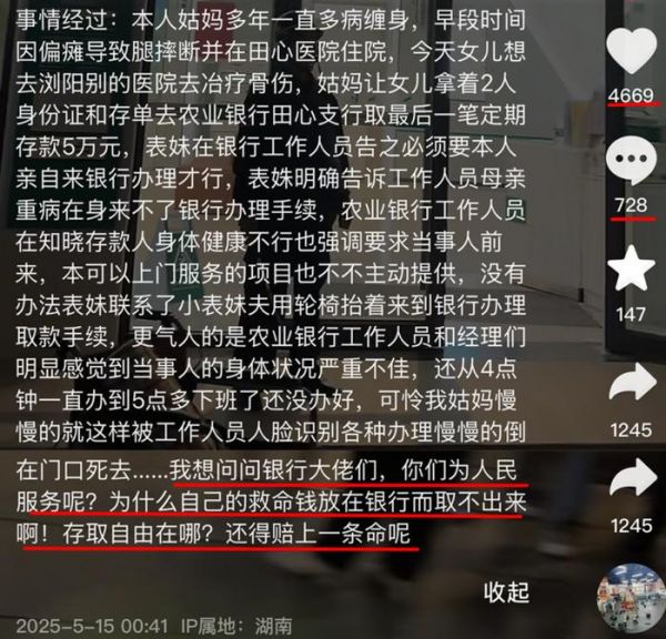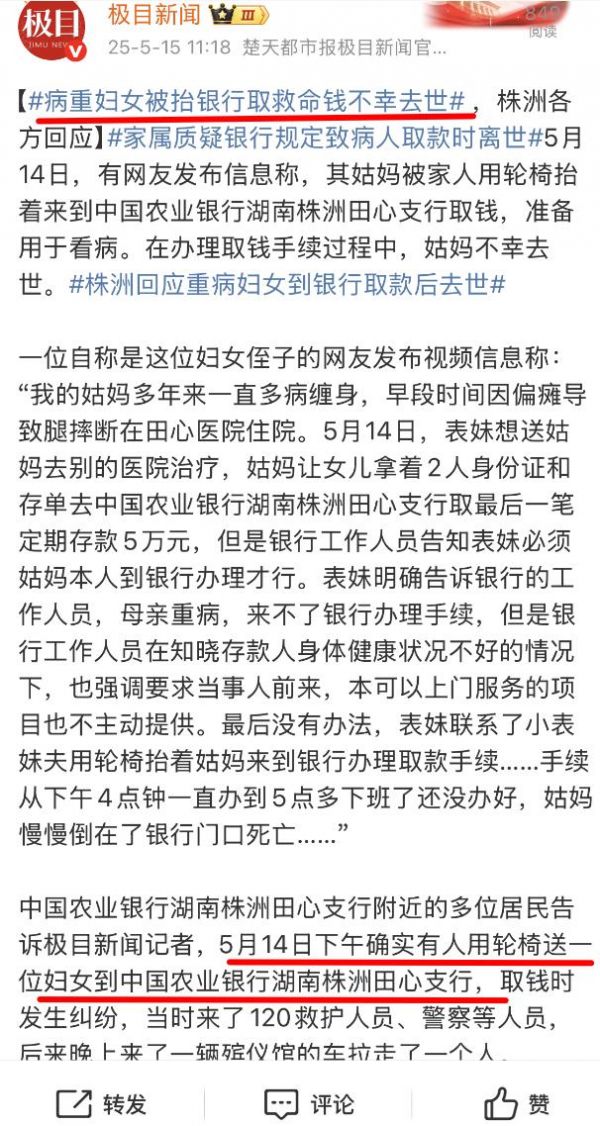 还是极目新闻发布的报道,5月15日消息,有名男子在某社交平台上爆料,称他姑妈之前因为摔伤到医院治疗,然后她女儿带着她的身份证到银行取最后一笔5万块的存款用来治病,结果被银行卡住了。和那个让眼球缺失的盲人睁开眼睛一样,银行要求“摔断腿的姑妈,也就是账户本人亲自到场办理。”