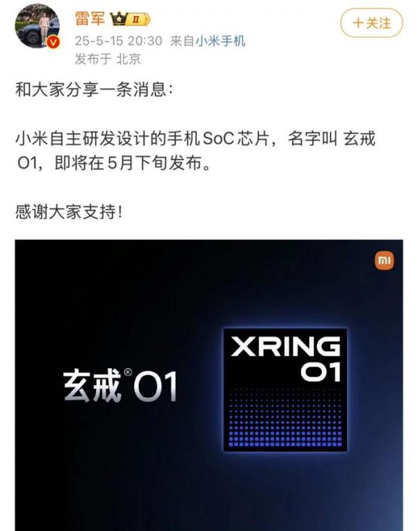 5月15日,小米创办人、董事长兼CEO雷军在微博发文称,小米自主研发设计的手机SoC芯片,名字叫玄戒O1,即将在5月下旬发布。