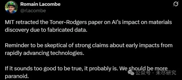 一位斯坦福毕业的化学工程背景的AI创业者和研究者认为,这提醒我们:对于那些宣称新兴技术已带来重大早期成果的说法,应保持怀疑态度。如果听起来好得不像真的,那它很可能就不是真的。我们应该更加警惕。