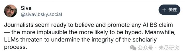 “记者们似乎总是愿意相信并宣传各种AI的夸大说法——越不可信,越容易被炒作。与此同时,大语言模型(LLMs)正威胁着学术研究过程的诚信度。”