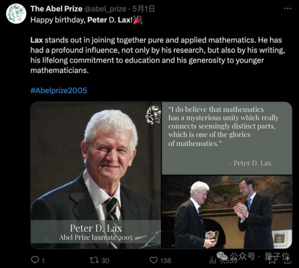 值得一提的是,今年5月1日拉克斯刚刚过完他99岁的生日,阿贝尔奖官方亲自发文祝贺,并给予了这样的评价: