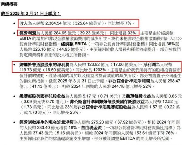 根据财报,截至2025年3月31日止季度,收入为人民币2364.54亿元(325.84亿美元),同比增长7%。经营利润为人民币284.65亿元(39.23亿美元),同比增长93%;归属于普通股股东的净利润为人民币123.82亿元(17.06亿美元);净利润为人民币119.73亿元(16.50亿美元),同比增长1203%。
