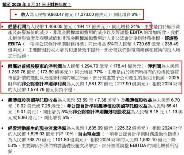 截至2025年3月31日止财务年度,收入为人民币9963.47亿元(1373.00亿美元),同比增长6%;经营利润为人民币1,409.05亿元(194.17亿美元),同比增长24%;归属于普通股股东的净利润为人民币1294.70亿元(178.41亿美元);净利润为人民币1259.76亿元(173.60亿美元),同比增长77%。2025财年的非公认会计准则净利润为人民币1581.22亿元(217.90亿美元),相较于2024财年的人民币1574.79亿元保持平稳。