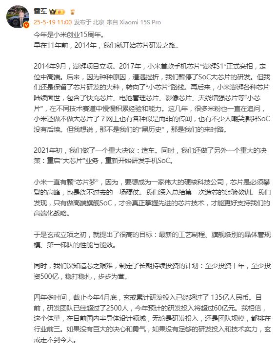 雷军发长文官宣:小米3nm芯片来了