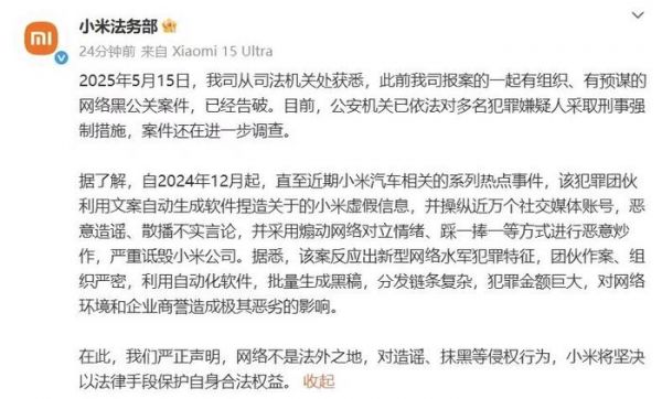 巧合的是,小米法务部今日宣布,公安机关近日破获了一起针对小米公司的网络黑公关案件,该黑公关团伙操纵近万个社交媒体账号,利用文案自动生成软件捏造关于小米的虚假信息,恶意造谣、散播不实信息,并采用山东网络对立情绪、踩一捧一等方式进行恶意炒作,严重诋毁小米公司。目前相关犯罪嫌疑人已经被采取刑事强制措施。
