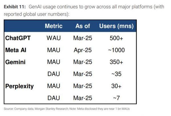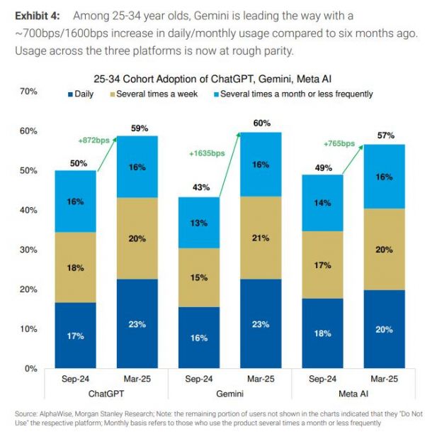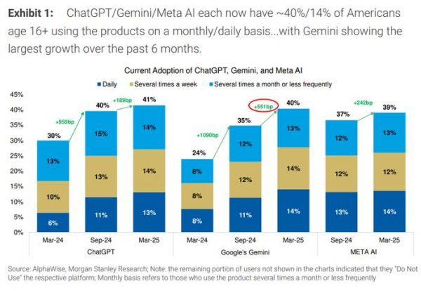 摩根士丹利称,从日活数据来看,约有3500万美国人每天使用ChatGPT、Gemini或Meta AI。在月度使用率方面,这三大平台各自吸引了约40%的16岁以上美国人,相当于每个平台约有1亿美国用户。但摩根士丹利也指出,这其中存在大量重叠用户。