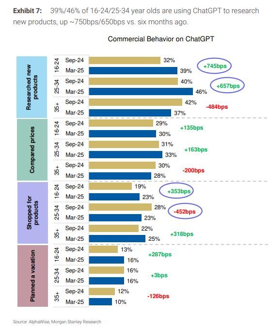 调查显示,39%/46%的16-24/25-34岁年轻人使用ChatGPT研究新产品,较6个月前分别增长了约750/650个基点。