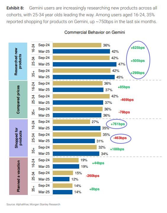 Gemini用户在所有年龄组都越来越多地研究新产品,25-34岁年龄段领先。16-24岁的用户中,35%报告在Gemini上购物,较6个月前增长约750个基点。