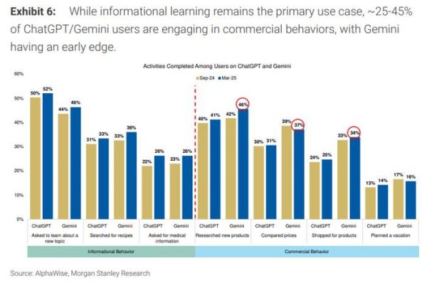 调研报告显示,虽然信息性学习仍是主要使用场景,其中52%和46%的ChatGPT以及Gemini用户表示使用这些平台学习新主题,但约25-45%的ChatGPT/Gemini用户已开始进行商业行为交互:
