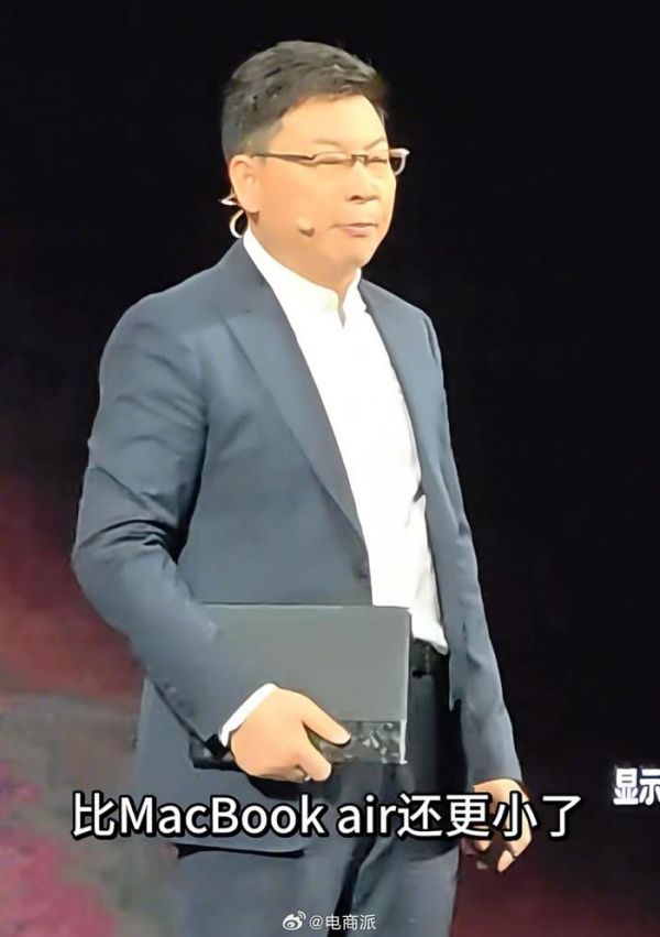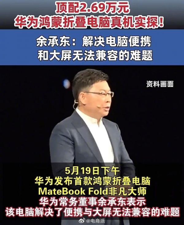 余承东展示全球首款华为鸿蒙折叠电脑,展开超大,合上比苹果MacBook air更小,颠覆行业。