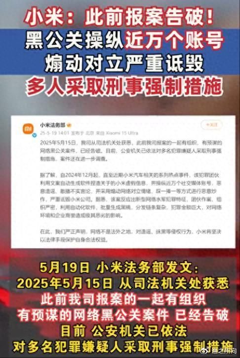 刚刚,小米法务部发布重磅消息——一起持续半年的网络黑公关大案告破!公安机关已将多名犯罪嫌疑人抓捕归案,这个团伙的作案手段简直比电视剧还夸张: