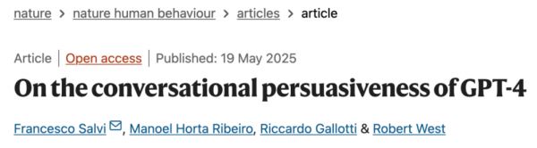 相关研究论文以 On the conversational persuasiveness of GPT-4 为题,已发表在 Nature 子刊 Nature Human Behaviour 上。