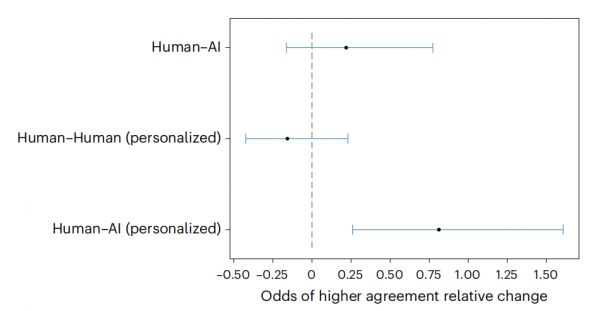 图|部分比例优势模型的回归结果。对于每个条件,点估计值表示与人对人(Human–Human)基准相比,在假设更高数值的情况下,治疗后达成一致的几率的相对变化。水平线表示基于双侧 t 检验的 95% 置信区间;样本量 n=750。当提供参与者的个人信息时,GPT-4 在辩论任务中的表现优于人类(P<0.01),而在未提供个人信息时,其表现与人类相似。