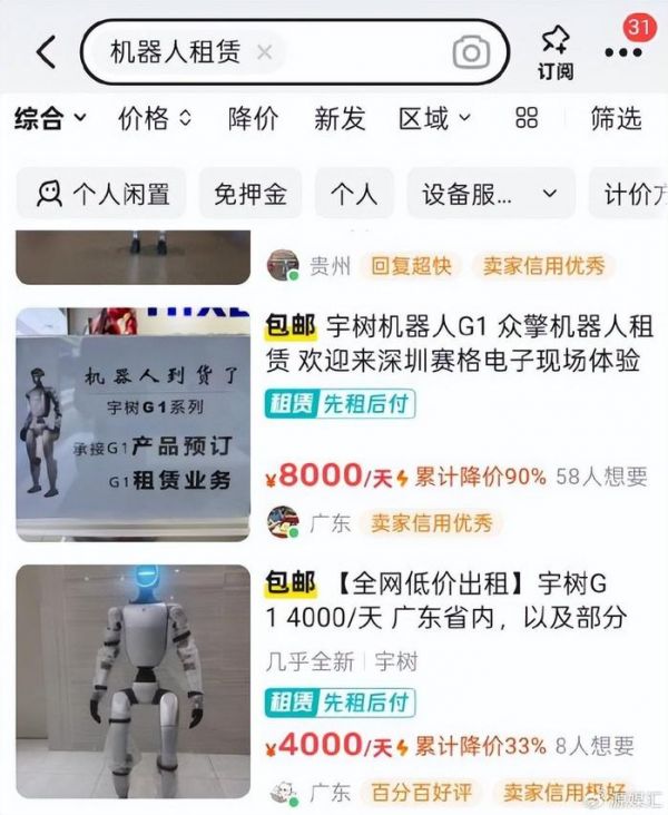 2025年2月中旬,上述产品在京东首发开售被秒罄。在二手交易市场,宇树G1更是掀起租赁热潮,标注“春晚同款机器人租赁”、“宇树机器人”等字样的租赁商家大量涌现,人形机器人产品单台日租金从数千元到上万元不等,租赁用途广泛,涵盖商演、科普教育、开业迎宾等多个场景。